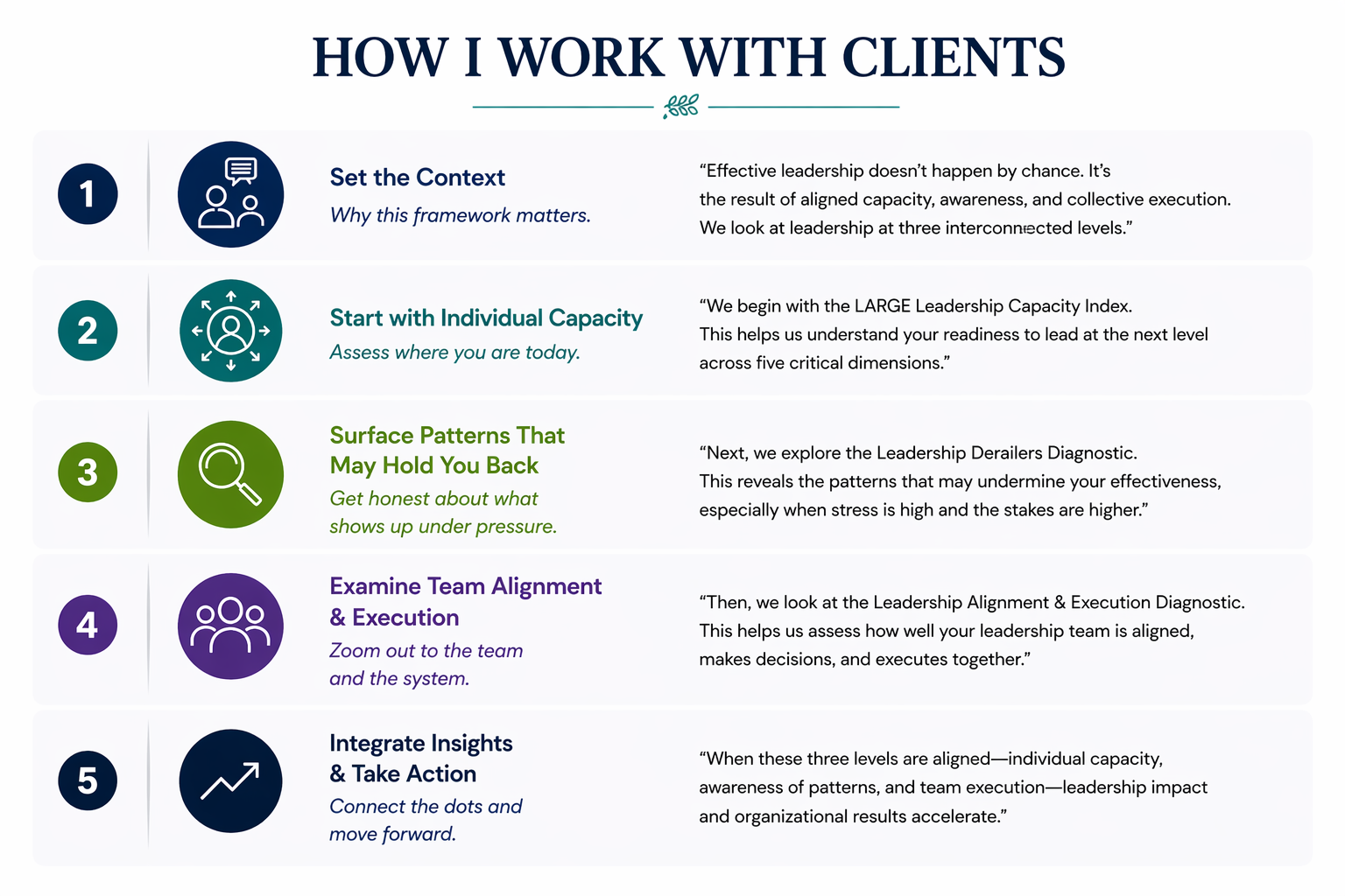 Leadership challenges rarely arrive with a warning label; they show up as subtle misalignment, inconsistent execution, or mounting pressure. I help leaders and teams bridge the gap between fragmented effort and streamlined execution—without losing the human side of leadership.